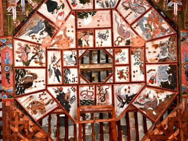 以前玉皇阁外院中有四条石龙。他说,石龙雕刻精致、形态逼真,以至于小时候的他对玉皇阁这个地方心存敬畏。可惜石龙也只存在于爷爷的故事和我们的想象中了。岁月无情,整个玉皇阁如今仅存的珍品就是“二十八星宿图”了。“二十八星宿图”,被称为“诺邓一绝” 确然名副其实。玉皇阁外,只有精致石刻、斑驳木棂还在诉说着光阴的故事。围绕玉皇阁 那些树龄八百余年的黄连木正值最美的时刻,红似火的热情与蓝天融为佳话,也让玉皇阁增添了一份勃勃生机。如今的玉皇阁已被保护起来,时常作一些小小的维护,大理州还计划复原外墙的雕刻。惟愿这些珍贵的文物今后能平安度过每一天,和周围的景致一样,在后人的眼中熠熠生辉。