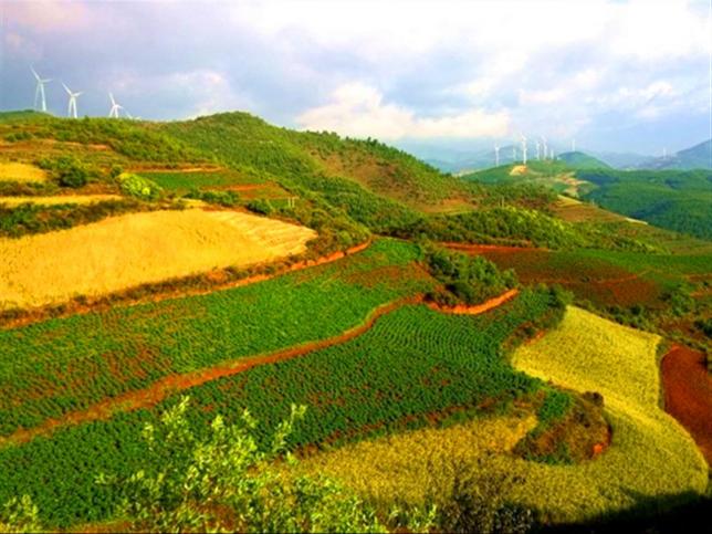 打马坎村位于昆明市东川区,距昆明市中心有全程约196.3公里,乘车要2小时半小时左右。早上日出前后在公路边的高坡上俯瞰打马坎村,红土围绕的村子里炊烟缭绕,村子四周杨树在朝阳斜射下泛着光辉,是一派宁静动人的田园风光。七彩坡和锦绣园是在不同的角度看大片起伏有致的山坡。