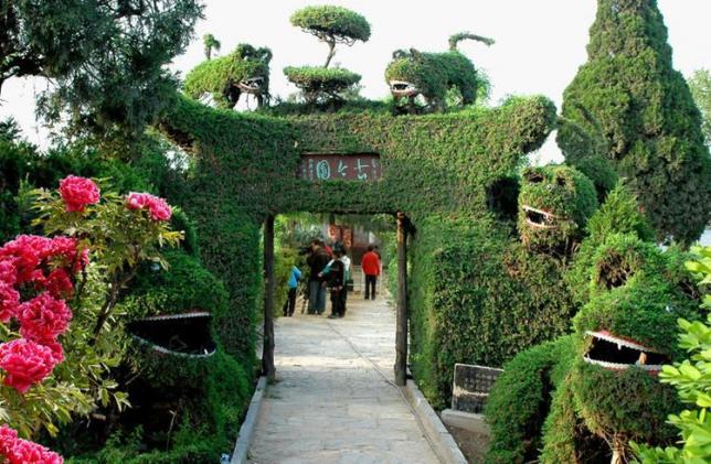 菏泽古今园位于菏泽市牡丹区王梨庄,是在明代万花村花园的基础上发展起来的。该园尤以松柏编制造型为其特色。松编是当地农民的传统技艺,编塑成城楼、牌坊和狮、虎等艺术造型,惟妙惟肖,栩栩如生,有绿色动物园之称。