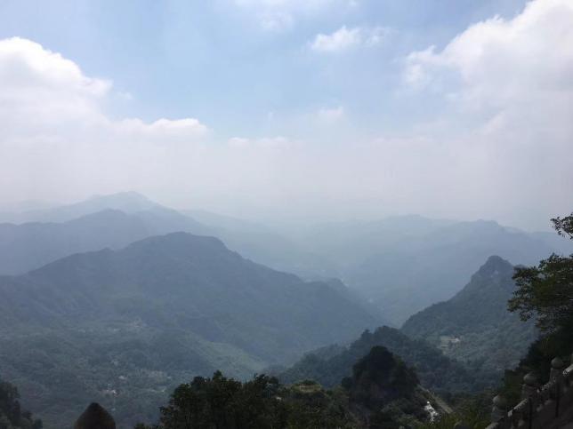 而阳光透过茂密的树冠,在古朴的石阶上留下了点点光斑,一路上,看着远处依山而起的古朴建筑,嶙峋的山石,听着潺潺的流水声和婉转的鸟语,微风徐徐,带来阵阵松树的清香,这种清新的感觉让人陶醉,仿佛置身世外桃源。进得山门,迎面是九曲黄河墙,只见道路是由一块块青石砖铺设而成,两旁的朱红色墙体上镶着绿色的琉璃瓦顶,整座墙体在山上划出了一条优美的弧线,曲折迂回,气势恢弘,如一条巨龙盘踞在山顶,不得不让人叹服。