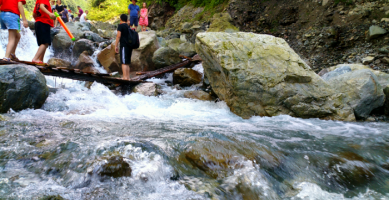 蟠龙谷是青山绿水间的隐者。它地处湔江河上游,为龙门山系光光山支脉梅子林沟、锅匡岩阶地。全年雨水充沛,森林覆盖率95%,是一片现代文明尚未侵蚀的神秘之地。其水源起于光光山,清澈见底,分级而下,绵延幽深的山谷中,密布着大小上百道瀑布跌水,形成罕见的瀑布群奇观