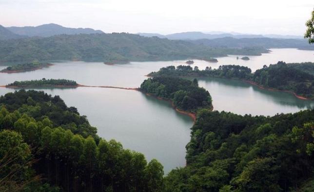 凤亭湖离南宁市区70公里的凤亭湖。有着“千岛湖”的美称,湖内有108座小岛,传说是梁山泊的108将星。凤亭湖的源头在十万大山,这里的湖水水平如镜,就像一颗绿宝石镶嵌在桂东南的上思、钦州和南宁市良庆区大塘镇3地的崇山峻岭间。
