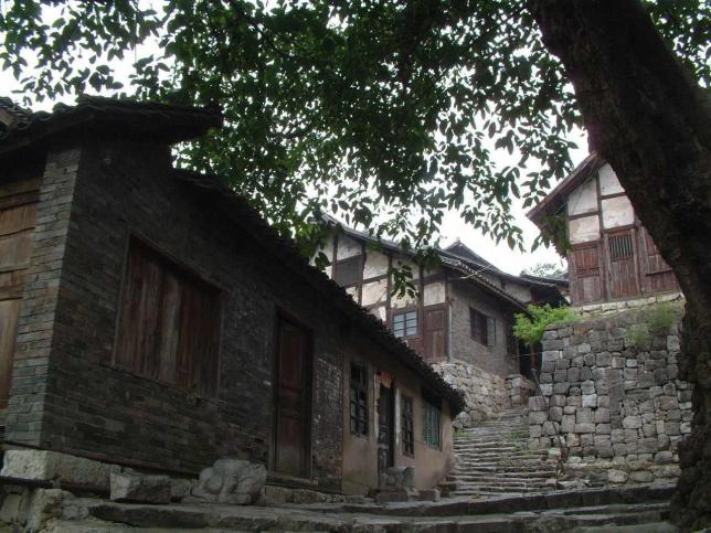 古镇中古街长约300米左右,宽不过2米,仍然还有保存完整的明清风格的川南为数不多的吊脚楼及清道光6年修建的禹王宫,尽管岁月的风雨和历史的重载给街道上顽强的石板路刻上了深深的皱纹,但两旁的木质民居建筑仍能映射出当年的华彩。