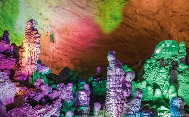 黄龙洞以其高阔的洞天、幽深的暗河、密集的石笋而出名。洞中众多的石乳、石柱等各种钟乳石,在灯光的照耀下,多姿多彩。特别是标志性景点“定海神针”,高达20米的钟乳石柱,最细处直径只有10厘米。黄龙洞面积非常大,全长约7公里,洞中最高处垂直高度约100多米,整个洞内洞中有洞,洞中有河。