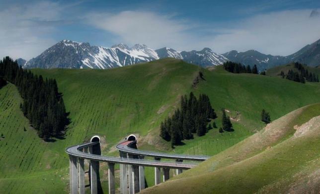 位于果子沟半山腰的龙岭山庄门外,可以看到传说中的果子沟大桥……的一段,也是相当壮观了。你依稀可以在上图中看到几间毡房,许多游客也会选择住在那里,但是条件特别艰苦,可能会对城市来的人造成一定的困扰。当然,龙岭山庄和其他城市里的酒店比起来,在住宿条件上也差了一截,但有美景在旁,就顾不得那么多了。