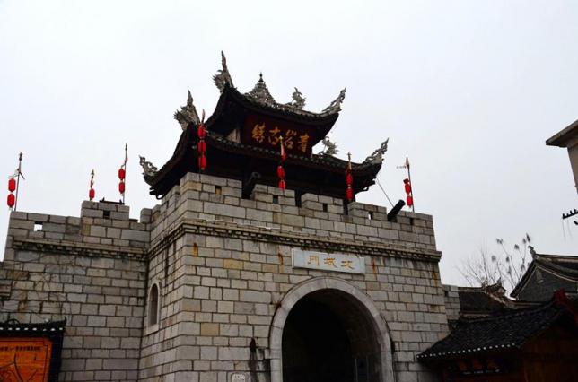 小镇,名青岩,位于贵阳花溪南12公里处,城门上大书“定广门”三个字。城门左右两边有逶迤城墙,上筑敌楼、垛口、炮台。全部用方块巨石筑就,一派青灰苍黑。