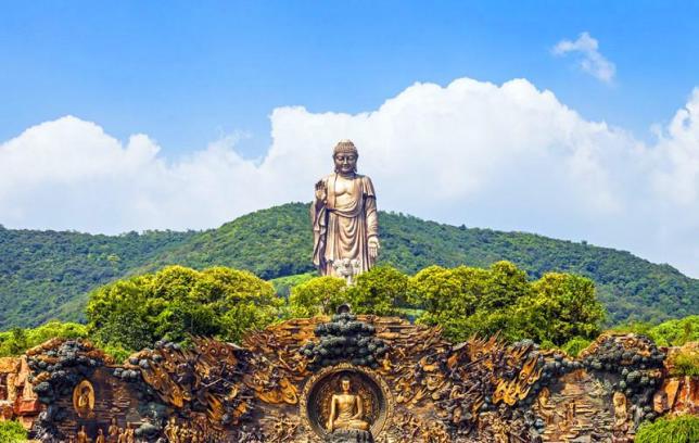 灵山大佛,坐落于无锡太湖边的小灵山上,是世界上最高的佛祖青铜立像,规模宏大十分壮观。大佛是中国五方五大佛之一,开光时有众多大师前来举办盛大仪式,传说对大佛祈福参拜十分灵验。大佛位于灵山胜境景区最内侧,距离大门约1.2公里,到大佛面前需要从景区内步行或乘观光车来到大佛前的广场,从广场到大佛脚下需要走288级台阶,不过坡度平缓并不费力。参观灵山大佛,首先会感受到的便是大佛的规模,整个大佛通高88米,其中佛体高79米,大佛的每个手指的直径就有1米。
