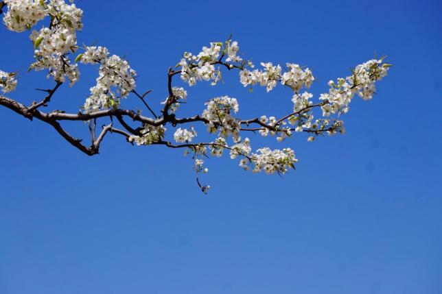 落花时节又逢君,春寒已然抖落,万物潮润。诗人云“梨花一枝春带雨,清风十里泥也香。”1999年首届彭州红岩“梨花节”塑造现代红岩闪亮登场,于是古老红岩名驰四方,从此年年春意满红岩,花开时节又逢君。三月伊始,红岩的九里埂上便是梨花烂漫,香气袭人,枝头花团锦簇,争奇斗艳,蝶飞蜂舞。看坡下的坡埂上,万亩梨花林一片莹白如玉,树上枝头嫩芽吐翠,鲜绿豌豆苗,附近菜花金黄,一片勃勃生机。