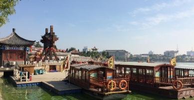 清明上河园的实景水战表演。园中游玩时能看到“包公巡汴京河”“王员外嫁女儿”“岳飞沙场点兵”“斗鸡比赛”“踩高跷”“蹴鞠比赛”等一系列具有北宋特色的故事场景演出和民俗表演。