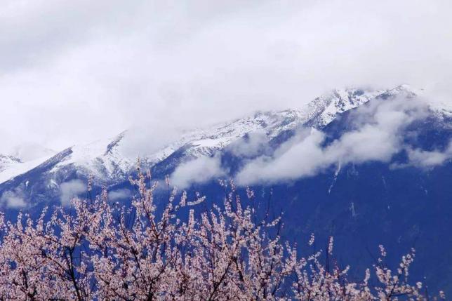 工布江达县,藏语意思为“凹地大谷口”,地处尼洋河的中上游。尼洋河两岸的雪峰上还覆盖着皑皑白雪,而桃花已如醉霞绯云般地竞相绽放。风轻拂而过,千姿百态的桃花像一个个婀娜多姿的少女随风摇曳,飘落一片片彩衣,尽显无限柔媚。不仅让人想起吴融的那首《桃花》“满树和娇烂漫红,万之丹彩灼春融。何当结作千年实,将示人间造化工。”