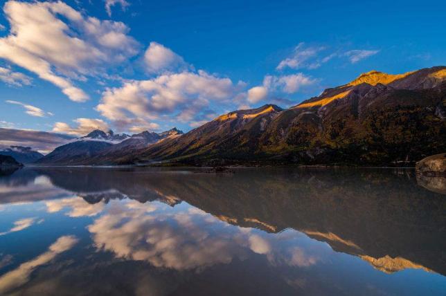 然乌湖的静和蓝是远近闻名的,湖中极少看到枯枝杂物,湖周景色各不相同。然乌湖的色彩非常丰富,草地、森林、秋叶以及白色的水禽和湖岸浅滩五颜六色的卵石,清新如镜面反映。