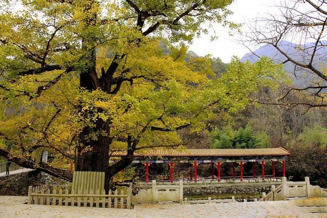 登封少林寺的大雄宝殿门前,也有一棵粗大的古银杏树,目测四五个人合围都围不住一圈。