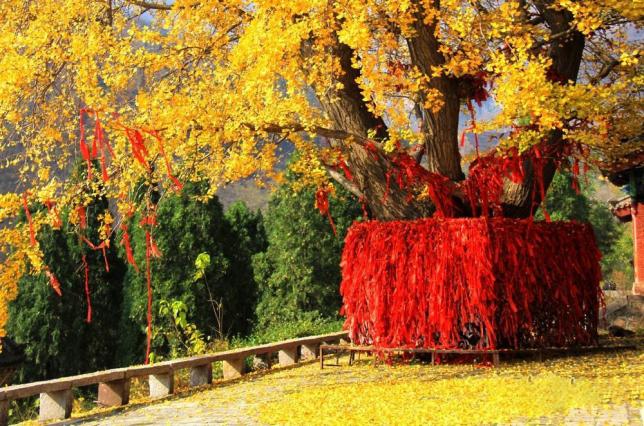 未走进寺庙,远远地就看到古树金灿灿的身影,如阳光之花,盛开在禅寺上方,和远处的山、神秘的寺庙和这棵千年银杏树相互映照,散发出神秘气息。