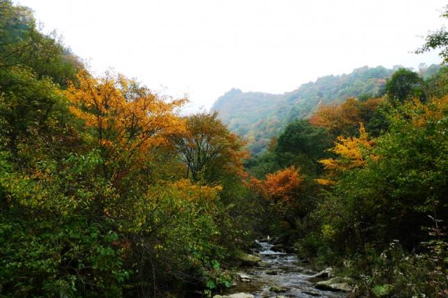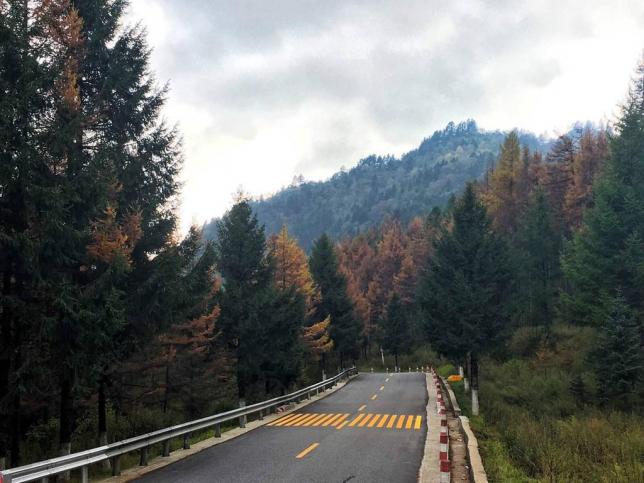 分水岭是一个制高点,站在分水岭上向南望比向北望风景要好得多—延伸的公路、近山满山的红叶、远山 层层群山,构成了一幅经典的大山水墨画。