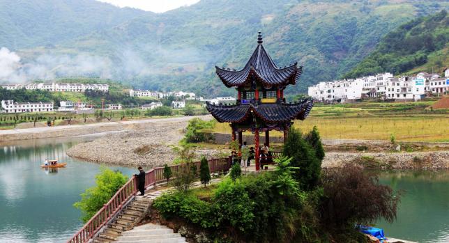 平利县龙头村周围山脉蜿蜒起伏,清清的冲河水环村缠绕,行如游龙,新建的村落清一色的徽派农舍建筑,村外一块块整齐划一的绞股蓝园、树苗林、小型盆景培育地和茶园,与农家乐、小作坊相映成趣,把这里天的蓝衬得特别深,白云衬托得银亮而富有立体感。