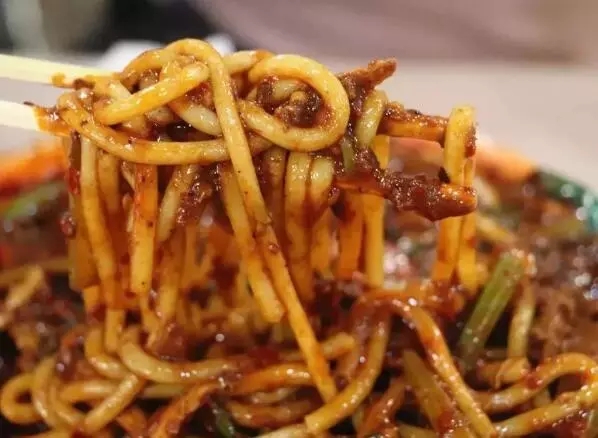 拉条子改刀,加上蔬菜牛羊肉同炒,就变成了热辣入味的丁丁炒面。