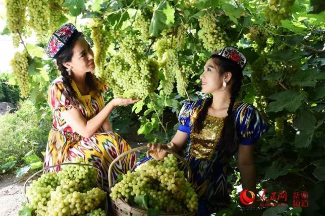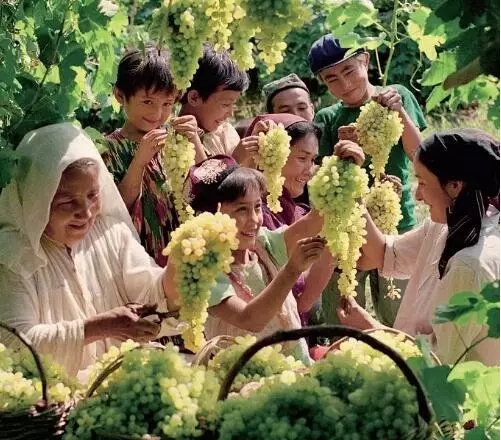 新疆 有两千年的葡萄种植历史, 吐鲁番 是葡萄的盛产地,几乎家家庭院里都种植葡萄,“城在葡萄中,人在葡萄中”。每年8月前后,葡萄成熟,一串串沉甸甸的葡萄在阳光的照耀下,显得特别饱满多汁,无比诱人。