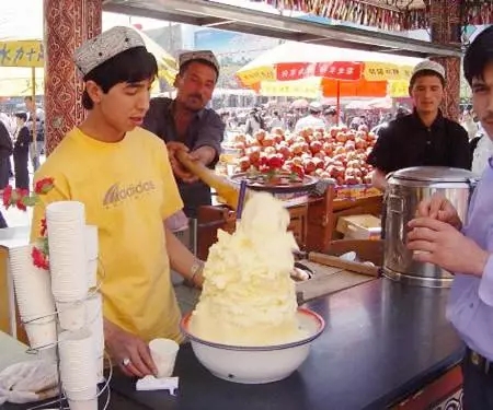 伊犁 大大小小的巴扎上,总有那么一个冷饮摊,冰激凌高高堆在大盆子里,奶香浓厚醇香,但口味清爽一点也不腻,鲜美到地球炸裂,完虐任何品牌的冰淇淋!