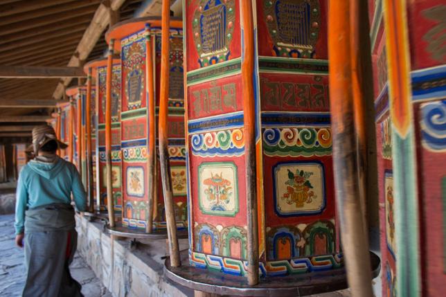 拉卜楞寺的外围有着号称世界最长的一圈转经筒,大约3公里,转完一圈大概要一个小时,每天早上开始,就会有信众在此虔诚地转经。宁静的清晨,只有转经筒转动的声音和人们小声念经的声音,感觉非常棒。