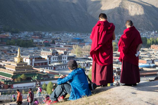 在寺院后面的草地上,你很有可能会遇到成群的小僧人在这里玩耍、赛跑,驻足在这里,很容易就被他们这种单纯的快乐所感染。纯净的景色中,一群红衣少年与世无争,真得是一幅很美好的画面。