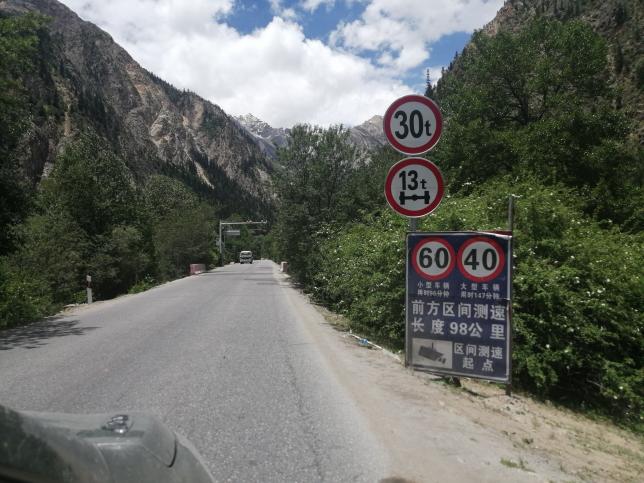该路段约90公里,严格执行开纸质限速条方式管制,上一个警务站开限速条,下一个警务站交还限速条,若超速,当值警官处罚方式不一,有扣分罚款,有吊销驾照,有按超1分钟等1个小时的方式处罚等等;另;此路段晚上20:00以后禁止一切社会车辆通行!因为全程为急弯、临江、易落石路段!