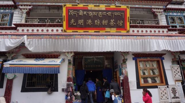 光明港琼甜茶馆门口就是到大昭寺的主要 通道 丹杰林路,商业繁荣,加上茶馆的价格地道,虽然内部环境很一般,就是一个简单的集体食堂一般,但这个茶馆名气、人流量在当地都是最大的。甜茶馆门不大,很有藏式风格,进了大门,里面大厅很宽敞,有好几排长条矮桌,很有藏式风格,是我们这些游客体验民风的好地方。