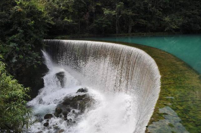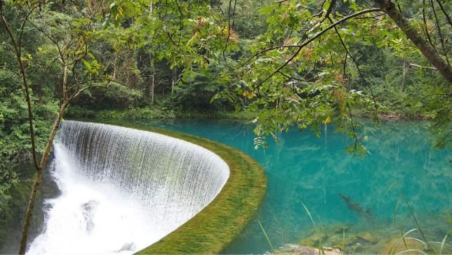 被誉为“超级盆景”的荔波小七孔景区,竟在宽仅一公里,长12公里的狭长幽谷里,集洞、林、湖、瀑、石、水、植物等多种景观于一体,最著名还是那一汪碧水之上的小七孔古桥。桥由麻石条砌成,桥身爬满藤蔓和蕨类,古色古香的桥下是绿得令人心醉的涵碧潭,桥与水中倒影互为一景,形成圆形孔状。