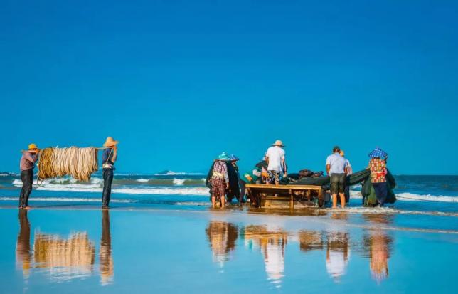 屿南湾,本地人称"焦作"海边,这里有个双面海,其实是离海边很近的一个小屿,叫南屿,傍晚退潮的时候可以走过去。这里的海域一般都是本地人在游泳,虽没有大沙滩,却少了那分嘈杂,也会有搬网的渔民在做业——拉山网。拉山网在南门湾、马銮湾、金銮湾都有,大多在傍晚的时候,要是运气好,刚好碰到他们在搬网,可以加入他们,体验一下拉网的快乐。