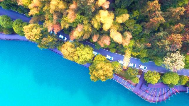 一条木板建造的栈道弯弯曲曲伸向浓郁的绿丛深处,绿叶中夹杂着秋冬的气息,旁边是静谧的湖水,一边漫步一边可近距离地观赏波光粼粼的湖面