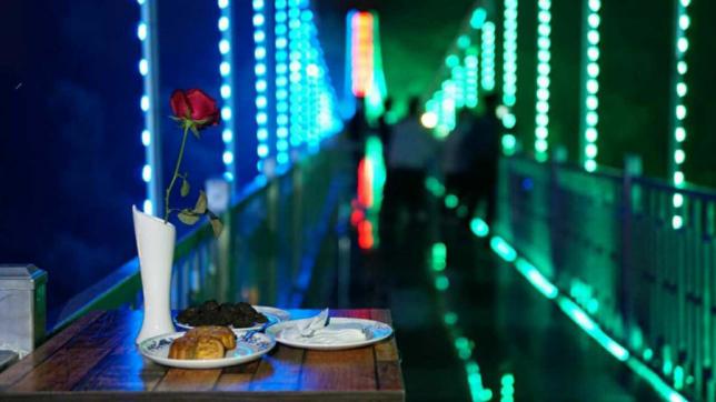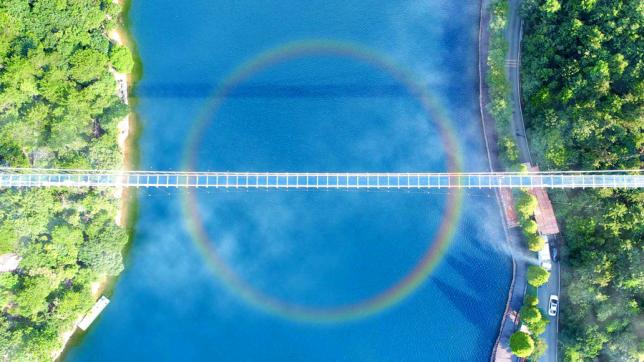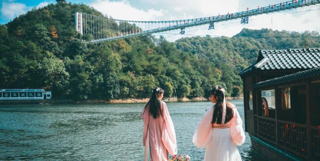 泛舟湖面,和风拂面,水波浩荡,映照着蓝天、白云和玻璃桥,仿佛鱼在云中游,鸟在水中飞