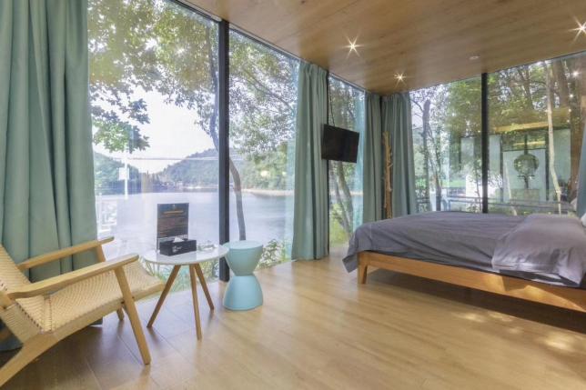 石燕湖境界屋位于长沙石燕湖旅游区内,临湖而建,采用单面玻璃的材质搭建而成,外面看不到里面,但是里面可以360度欣赏湖光山景,这感觉还是不错的~境界屋是一栋一栋的,每栋都有小阳台