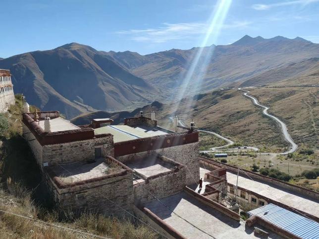 走上一个山间的小平台,可以俯瞰山谷的景色。继续往上走,左边远处有绘在山石上的佛像,后面的铁架子就是雪顿节时的晒佛台。