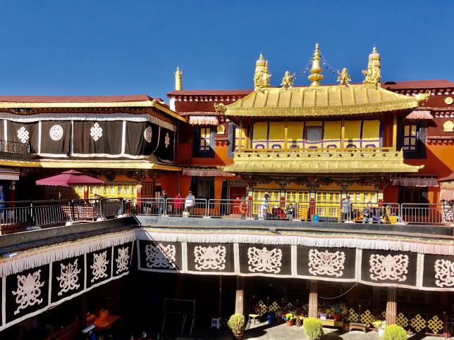 庭院旁有楼梯通往二楼和三楼,二楼有供奉藏王松赞干布、文成公主、尺尊公主的法王殿和供奉吉祥天母的班丹拉姆护法神殿。站在二楼宽阔的露台上,可远眺布达拉宫,是拍照的绝好位置。三楼的金顶也是大昭寺的看点之一,只不过三楼绝大多数时候不对外开放,万一机缘巧合可以登上三楼,四座金碧辉煌的金顶让人叹为观止。