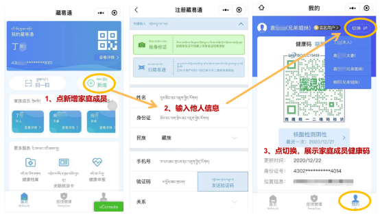 点击家庭成员,点新增,填写他人信息通过人脸认证后,即可在“我的”功能菜单,切换展示他人健康码。