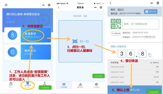 3.工作人员打开小程序扫出入人员“健康码”,登记上报体温。
