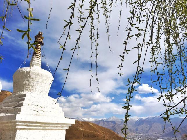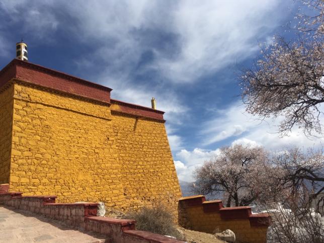 拉萨的三月,桃花开得正好,宫殿周围开满了淡粉色的桃花,虽然这里的桃花颜色远不及那般娇艳明媚,但在这片独特的高原苍穹下,伴随着历史变迁,它们仍旧守护着这历经千年沧桑的宫殿,一切都是那么引人遐想。微风吹佛着白色墙壁上的经幡,清脆悦耳的鸟叫声从身旁的树枝上传来,寺院内偶尔看见几个朝拜者,他们总是安静地做完朝拜的礼仪,然后离去。时间仿佛将这里遗忘,而此刻我只想停下来,闭上眼睛,静静的感受时光与那段封存千年的往事,聆听身旁的一切。