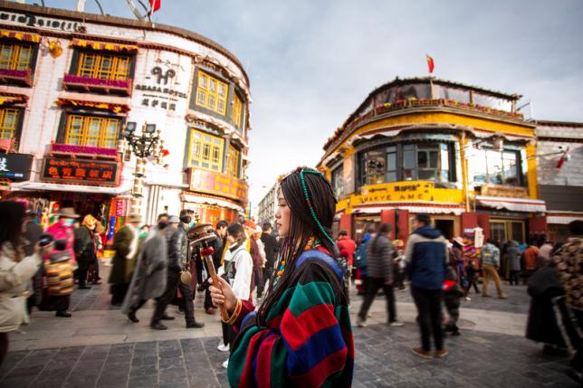 在拉萨,穿上色彩斑斓的美丽藏服,那一刻你就是一个藏族姑娘,仿佛与拉萨这座城市融为一体。