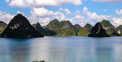 靖西渠洋湖旅游风景区位于靖西县城西北方向28公里处,总面积为2469.9公顷,总库容量为9200万立方米,其中湖面宽为15540亩,湖长为15公里,最宽处有1公里,是百色市的第二大人工湖。