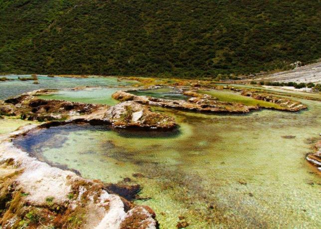 每个阶地上有十几个大小不同、形态各异的五色彩池,水深40-70厘米,彩池里水草相依,石花点点,疑为瑶池降临人间,可与”黄龙“媲美!
