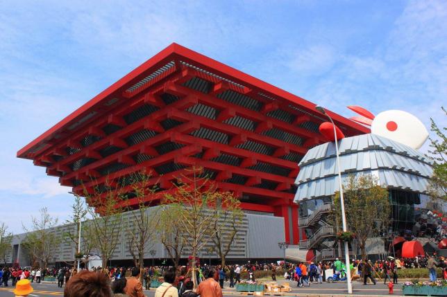 上海世博会中国国家馆建筑外观以“东方之冠”的构思主题,表达中国文化的精神与气质。国家馆居中升起、层叠出挑,成为凝聚中国元素、象征中国精神的雕塑感造型主体——东方之冠;地区馆水平展开,以舒展的平台基座的形态映衬国家馆,成为开放、柔性、亲民、层次丰富的城市广场;二者互为对仗、互相补充,共同组成表达盛世大国主题的统一整体。国家馆、地区馆功能上下分区、造型主从配合,空间以南北向主轴统领,形成壮观的城市空间序列,形成独一无二的标志性建筑群体。
