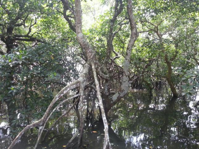 这里风光旖旎,千姿百态,涨潮时你可看见那密密匝匝的红树林飘飘逸逸潇潇洒洒的在绿色的海水中时露时现,甚至沉没于水底。每当海水退潮时,你可看见面那红树卷曲的树干和交错的地面根挽手挨肩而立。林中还可观鸟,或是垂钓,或是捉蟹,或是欣赏八门湾四周岸上那葱茏翠绿的椰林,其情趣可谓'独此一处'。