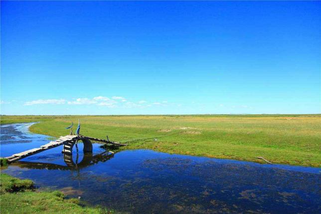 它跨过总面积480万亩的贡格尔草原,一个水草丰美、草原如茵似毯的地方。河流牵沼串泊,查干突河、贡格尔河绕贡格尔草原而过,似戴在草原上的翡翠项链,为青青的草原平添秀色。