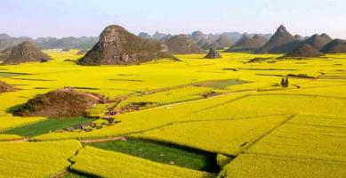 神奇而美丽的罗平峰林,位于滚滚珠江源头,磅礴乌蒙南麓,滇、桂、黔三省的结合部,峰林面积约1000平方千米,主要景区有:金鸡峰丛、十万大山、野猴谷等。“金鸡峰丛”是峰林的核心景区,这里山连着山绵绵无尽,层峦叠嶂,峰恋浩浩荡荡。