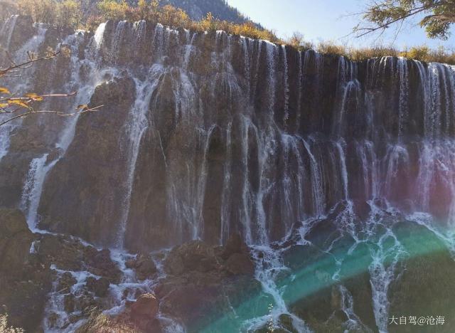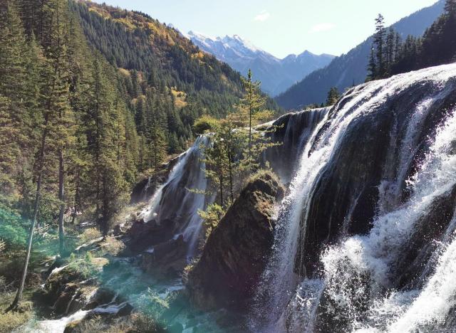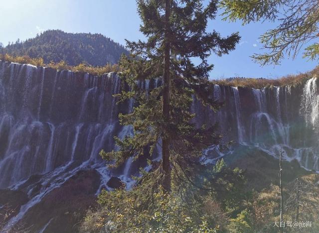 诺日朗瀑布位于诺日朗游客中心附近,是中国大型钙化瀑布之一。瀑布宽270米,高24.5米,也是中国最宽的瀑布,众多的影视剧曾在这里取景,包括中央电视台1986年版电视剧《西游记》的片尾就是在这里拍摄的。2017年8月地震被毁现在已经修复开放。在观景台上,瀑布全景尽收眼底,秋季时,瀑布的三百米飞流在秋色、云雾的衬托下,化成了一幕波澜壮阔的画面。