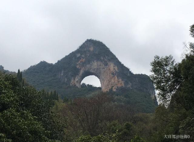 月亮山是阳朔境内奇景,是一座拱形山峰,山顶下方有一个贯穿的大洞,好像一轮皓月,浑然天成。从不同的角度看这座月亮山,此洞形状也随着不断变化,非常有趣。月亮山高约380多米,游人可顺着一条800多级的登山道直达山顶月洞。月洞面积很大,高宽各有50米,而山壁却只有几米厚。洞的顶部挂满了形状各异的钟乳石,其中两块很像月宫里的吴刚和玉兔。