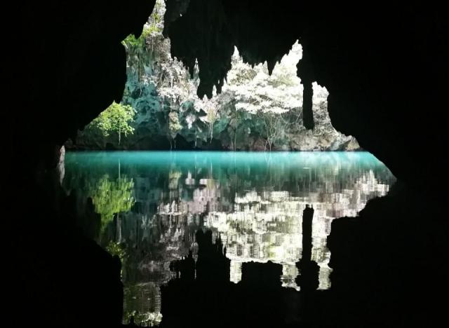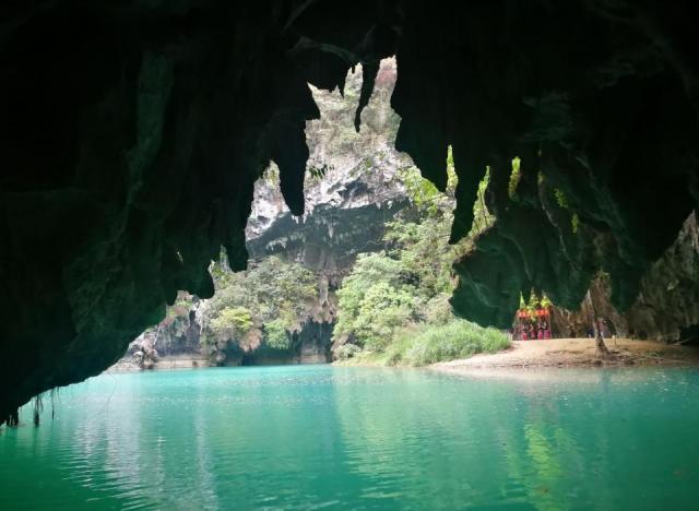 三门海水上天坑是典型的喀斯特地貌,老实说这样的景色广西遍地都是,唯一不同的就是这里的石山有地下河,坐着小船穿过三个山洞,观看所谓的天窗,可以说是别有洞天,游船进洞里面的,水很漂亮,整个人感觉进入仙境一样,简直太完美了。