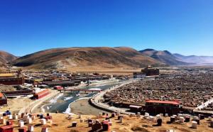 亚青寺始建于公元1985年,由大圆满成就者 喇嘛阿秋仁波切住持。寺庙建在四面环山的草原湿地上,有数千间信徒居住的小木屋,纵横交错的河流包围了整个寺庙的建筑群,每当清晨或黄昏,炊烟弥漫,河水闪耀着金光,颂经声随风远远传来,犹如天籁,动人心弦。