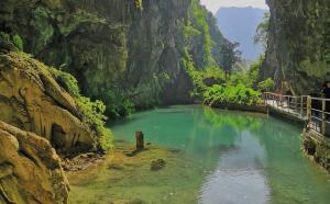 百鸟岩是个地下溶洞,长约一千五百米,有水上芦笛岩之称。每当朝霞初开或夕阳西斜的时候,成千上万的岩燕飞出洞口,贴水嬉戏,景象蔚为壮观,因此得名。乘小船前往洞中,船桨轻轻的摇动,墨绿色的河水泛出一圈圈的涟漪,把手轻轻放入水中,河水温润柔和,两岸竹影婆娑,人如在画中行驶。