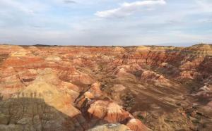 五彩湾位于昌吉州吉木萨尔县城北,在一片戈壁荒漠中有一个五彩缤纷的世界,那就是以怪异、神秘、壮美而着称的五彩湾。这是一幅大自然的杰作。千百年来,由于地壳的运动,在这里形成极厚的煤层,后几经沧桑,复盖地表的沙石被风雨剥蚀,使煤层暴露,在雷电和阳光的作用下燃烧殆尽,就形成了这光怪陆离的自然景观。
