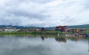 格萨尔王城的大街小巷都鲜花锦簇、红旗飘飘,漫步在珠牧圣湖的小道上,亲水空间、观景平台和慢行系统等风景优美。游客在格萨尔王城里,可远观皑皑的雪山,近赏碧水绿树、湖泊花草,鱼翔浅底,鸳鸯戏水,沁人心脾的美景十分让人沉醉。